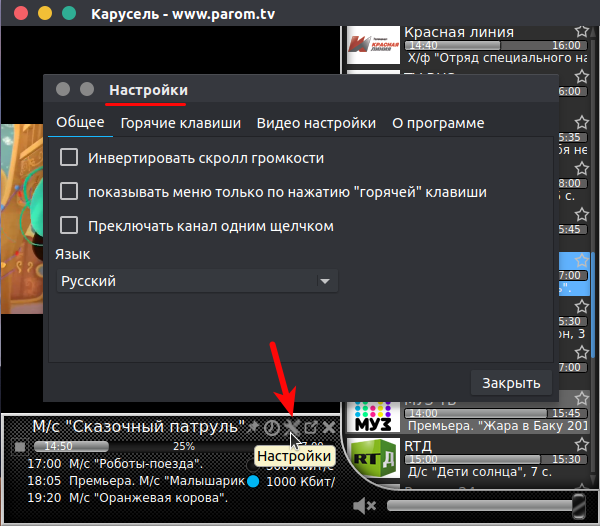 Parom TV Player - программа для онлайн просмотра телеканалов на компьютере, которая может быть легко установлена на Windows, Mac OS и Linux.